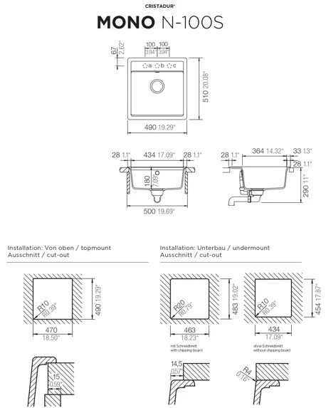 Cut-out size undermount: 514 x 454 mm